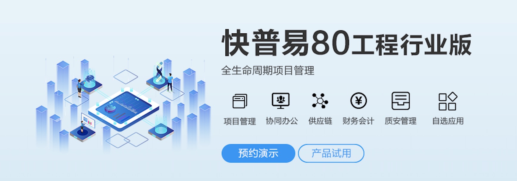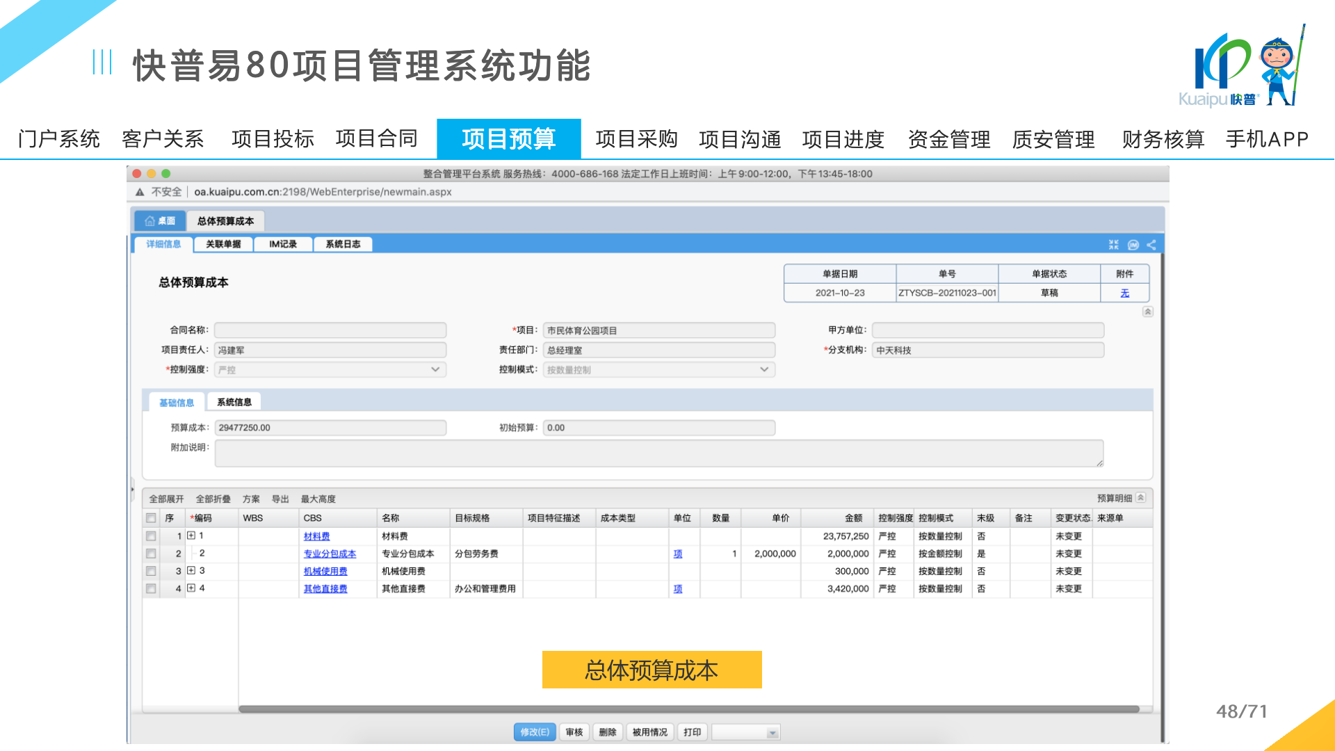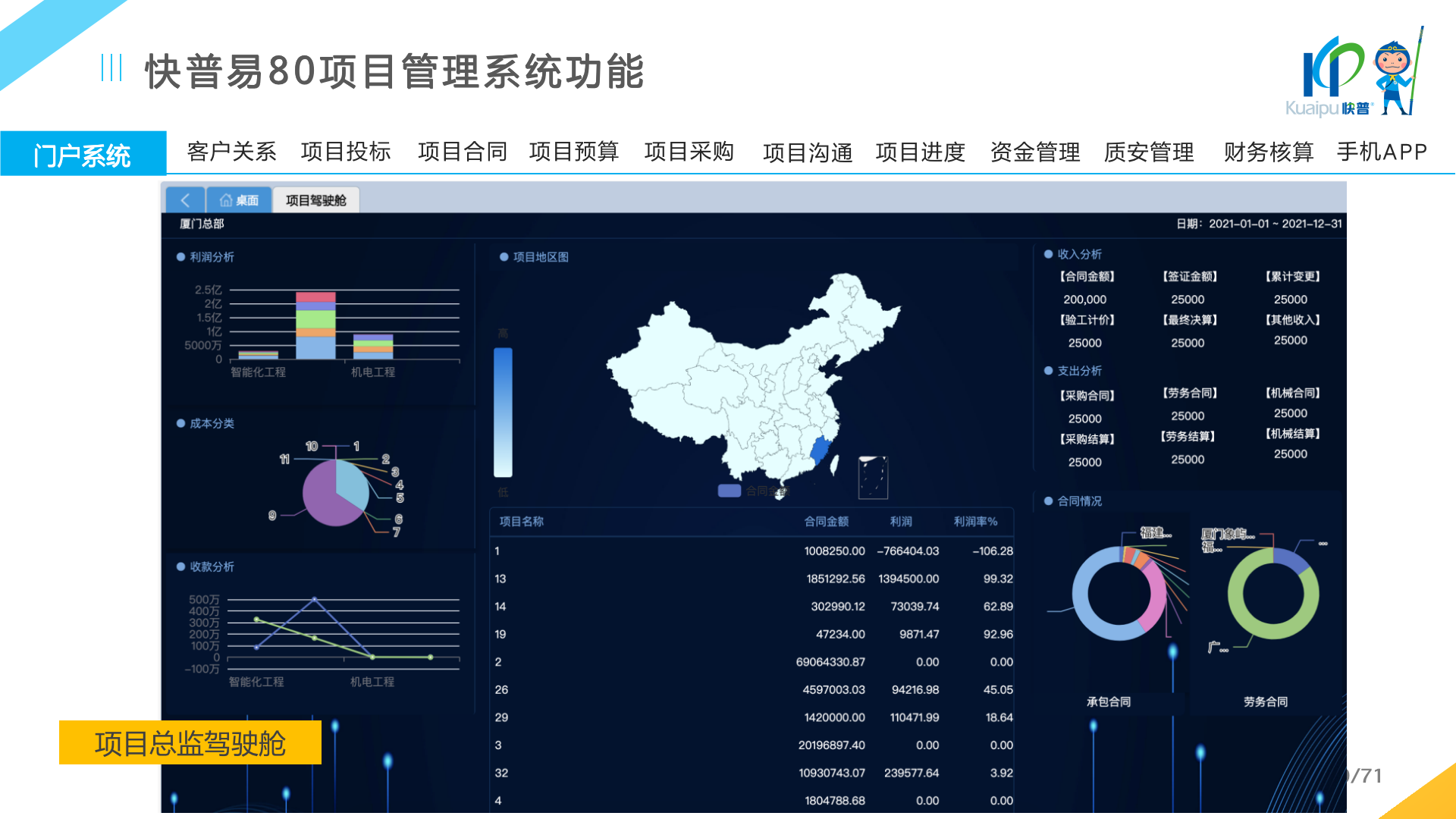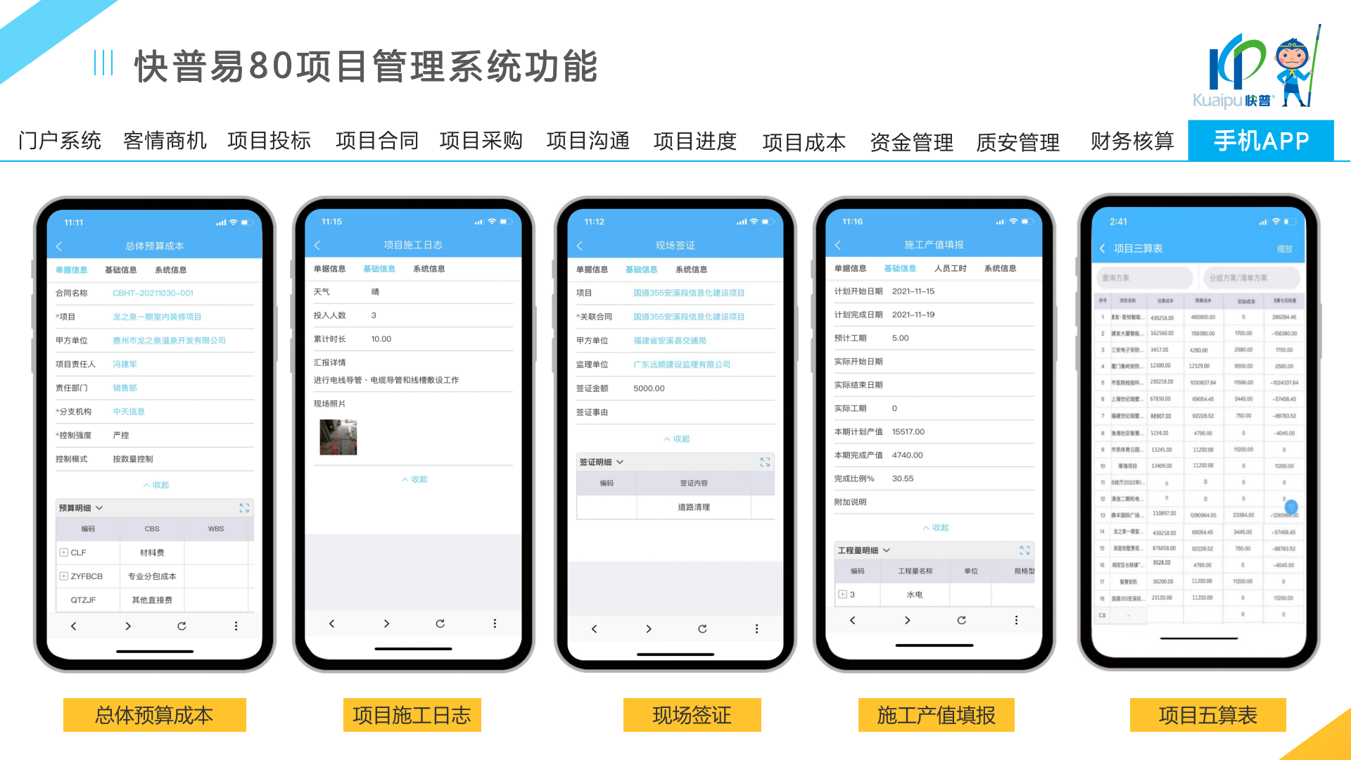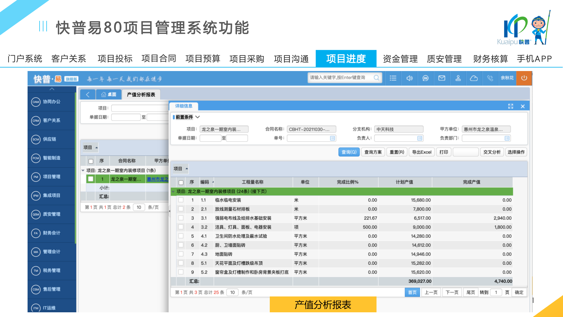 快普易80以項目管理為核心,通過“四控、四管、一協(xié)調”方式,對項目進度、成本、資金、質量安全進行全面控制,實現(xiàn)投標管理、合同管理、物資管理、預算管理等項目全生命周期項目的數(shù)字化管理,實現(xiàn)資源合理配置、保障良好的項目效益。