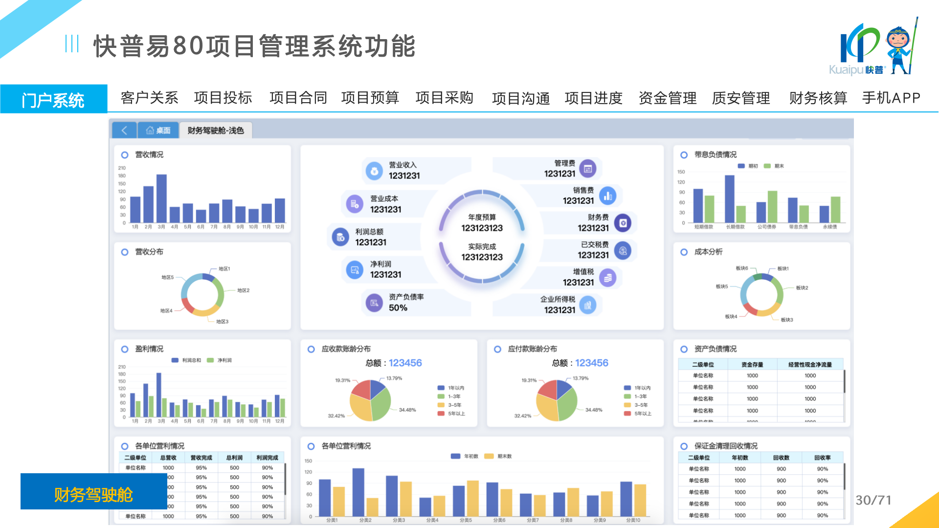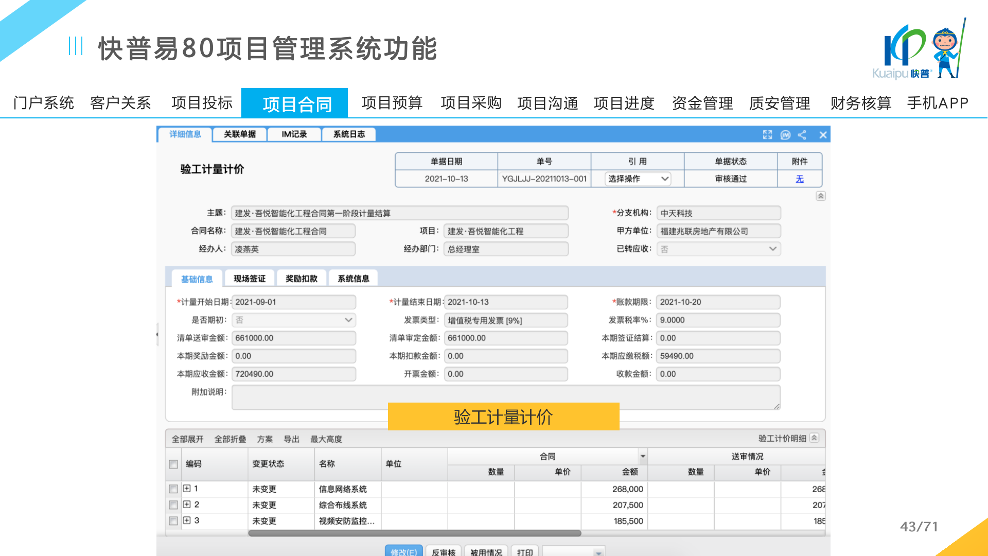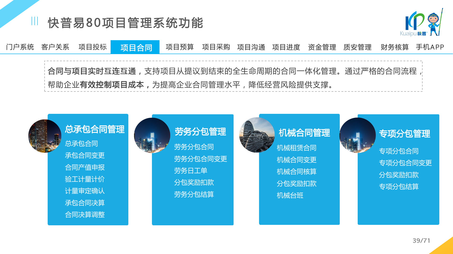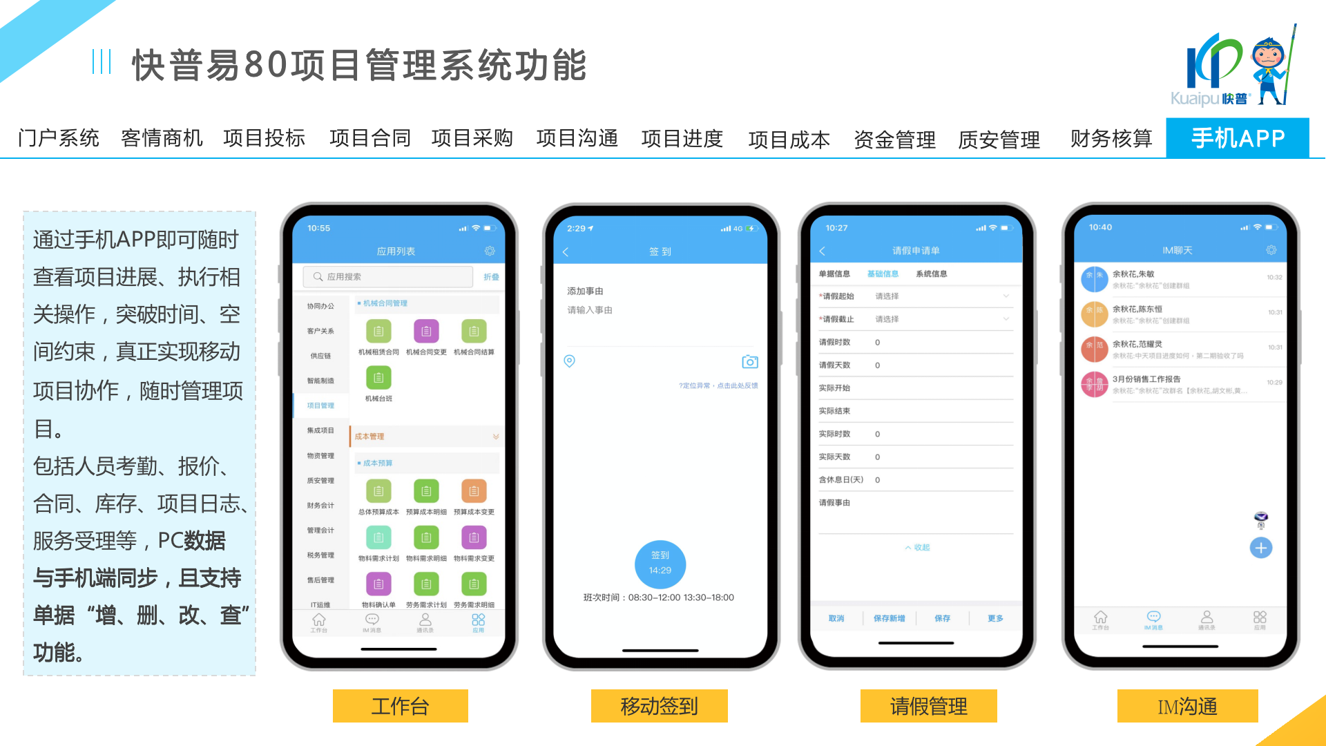 快普易80以項目管理為核心,通過“四控、四管、一協(xié)調”方式,對項目進度、成本、資金、質量安全進行全面控制,實現(xiàn)投標管理、合同管理、物資管理、預算管理等項目全生命周期項目的數(shù)字化管理,實現(xiàn)資源合理配置、保障良好的項目效益。