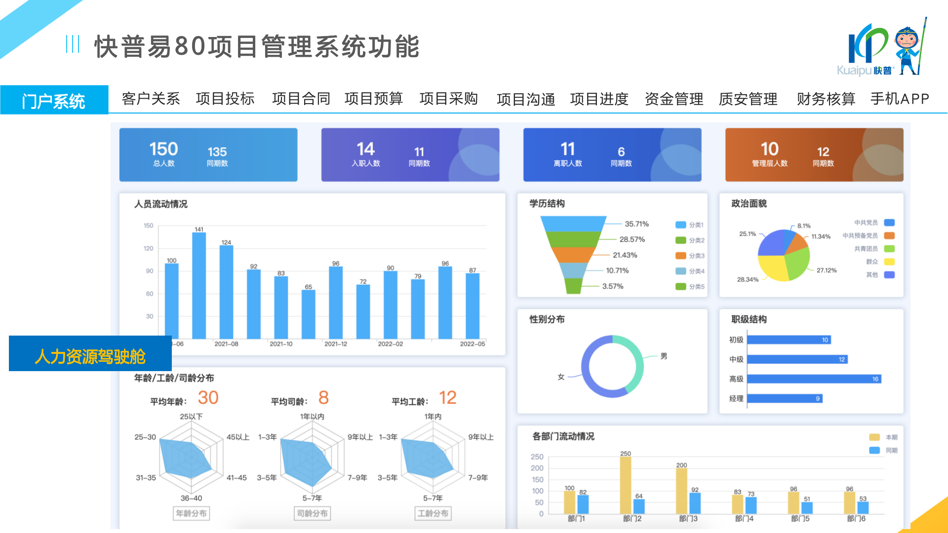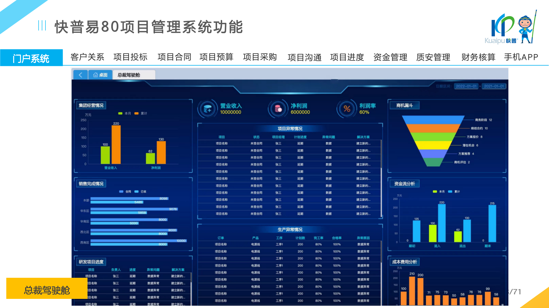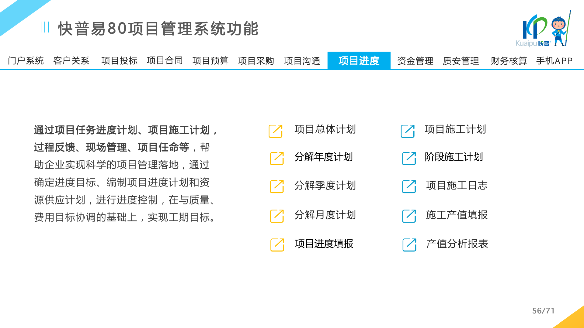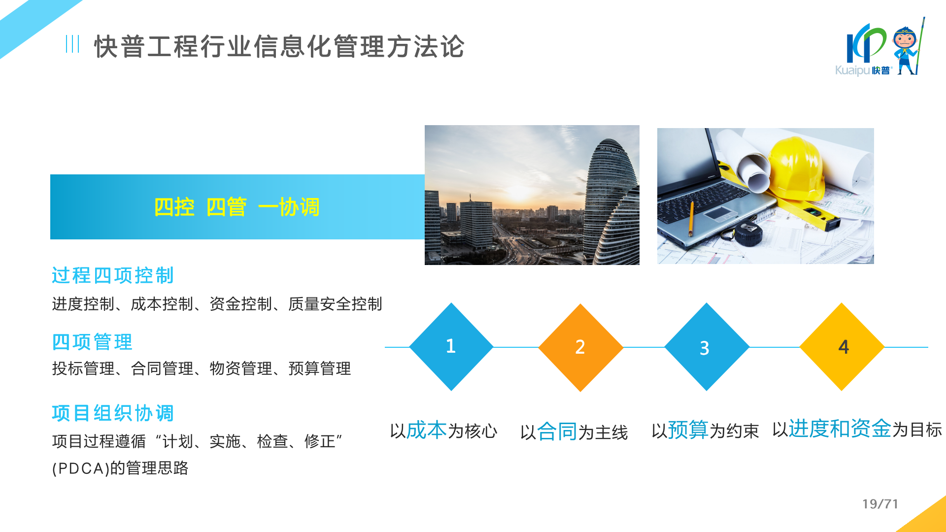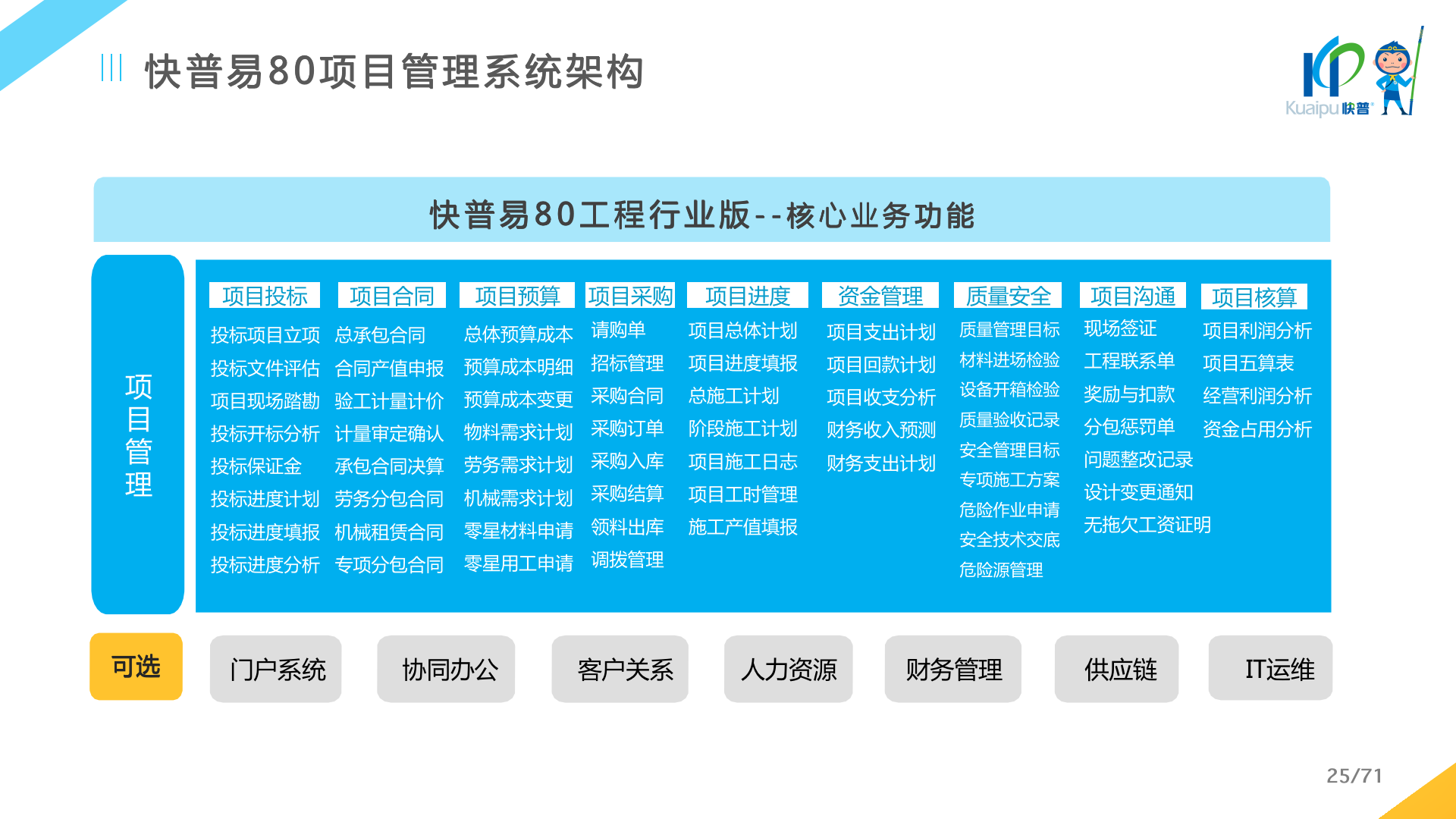 快普易80以項目管理為核心,通過“四控、四管、一協(xié)調”方式,對項目進度、成本、資金、質量安全進行全面控制,實現(xiàn)投標管理、合同管理、物資管理、預算管理等項目全生命周期項目的數(shù)字化管理,實現(xiàn)資源合理配置、保障良好的項目效益。