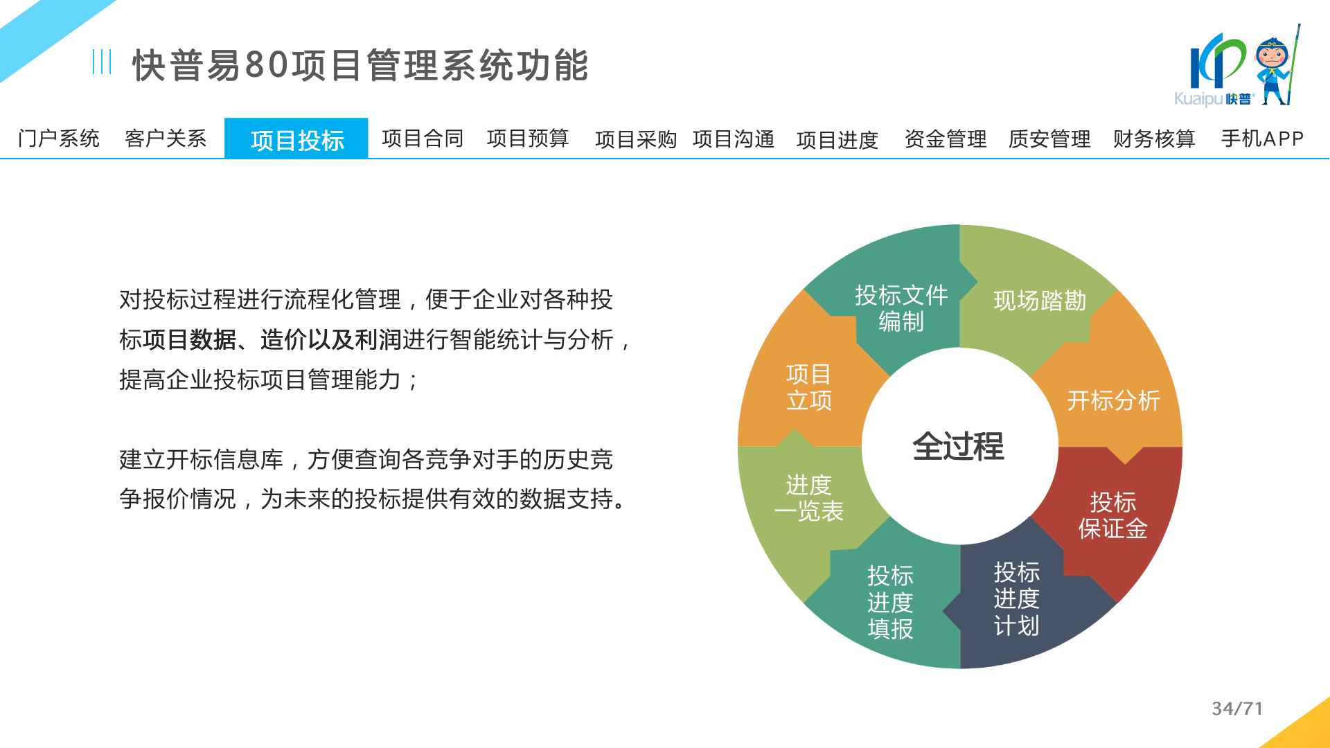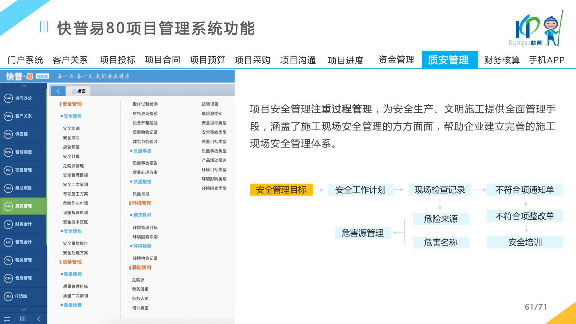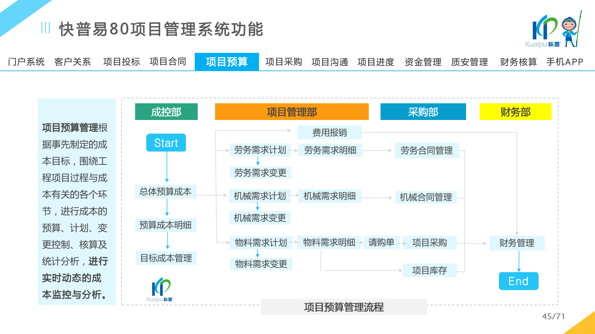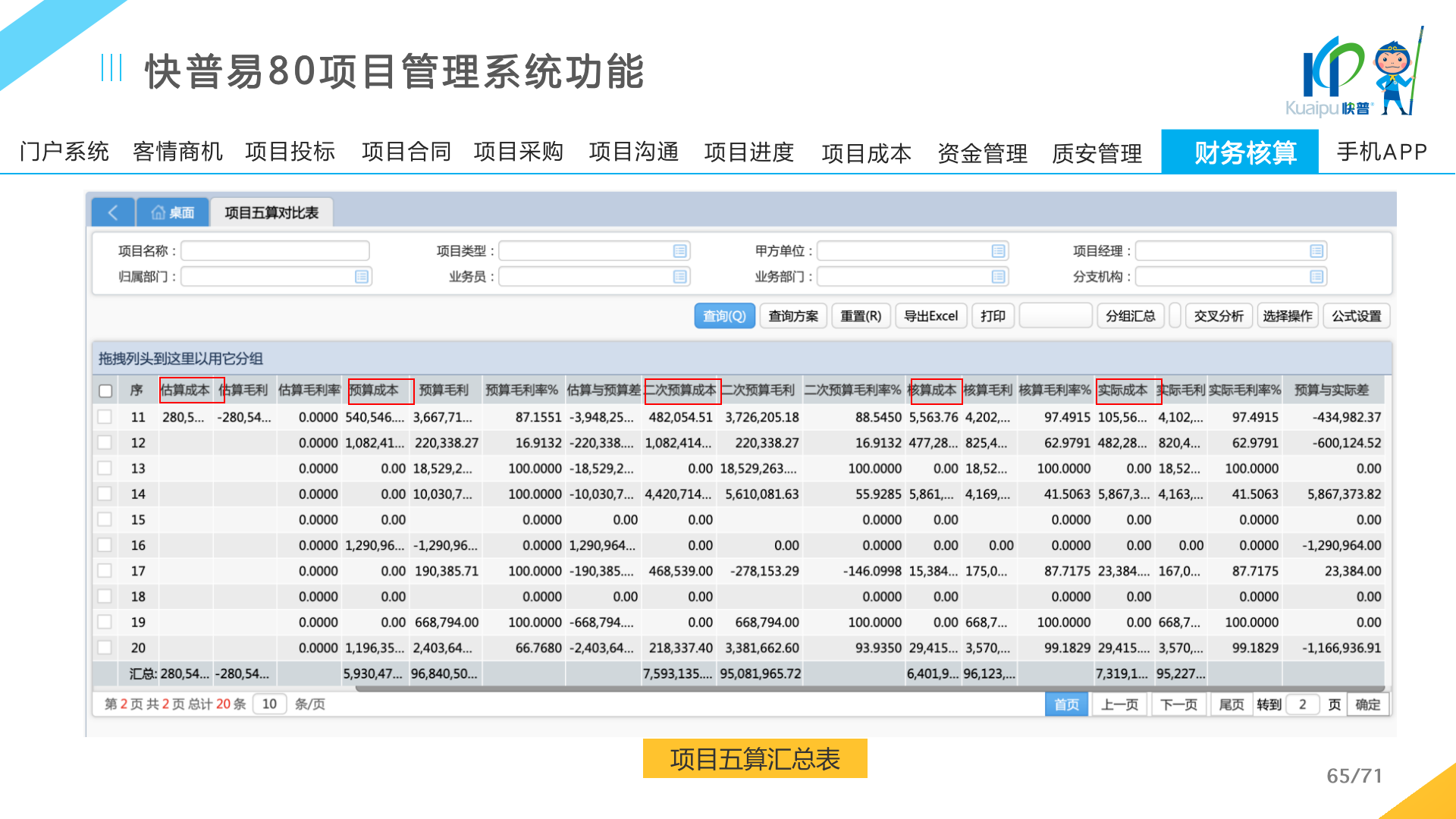 快普易80以項目管理為核心,通過“四控、四管、一協(xié)調”方式,對項目進度、成本、資金、質量安全進行全面控制,實現(xiàn)投標管理、合同管理、物資管理、預算管理等項目全生命周期項目的數(shù)字化管理,實現(xiàn)資源合理配置、保障良好的項目效益。