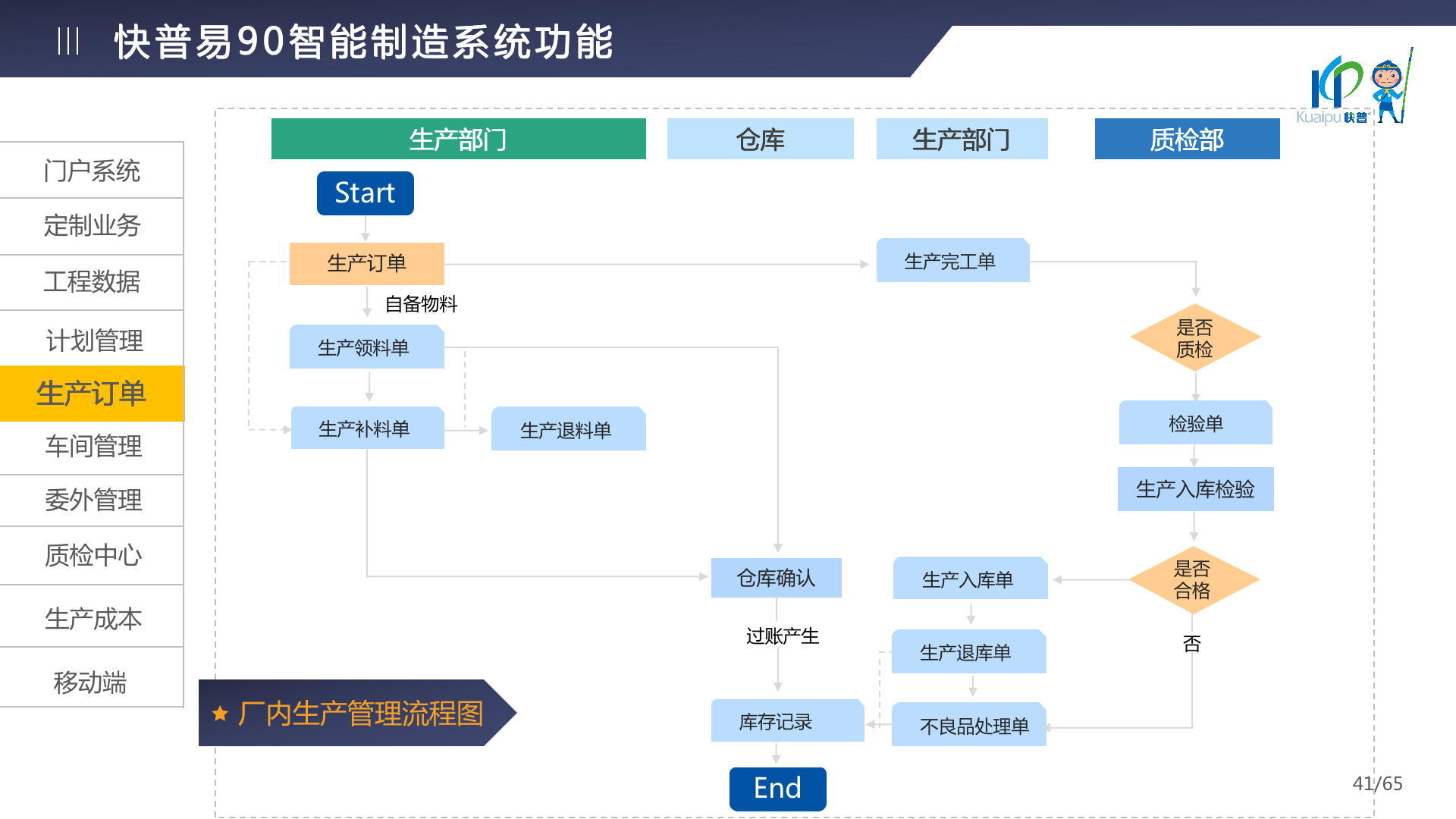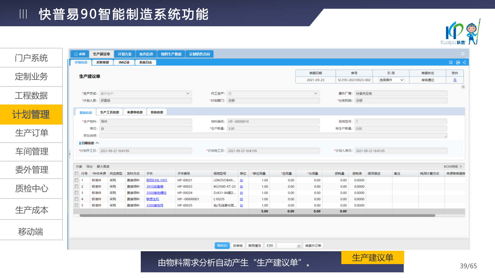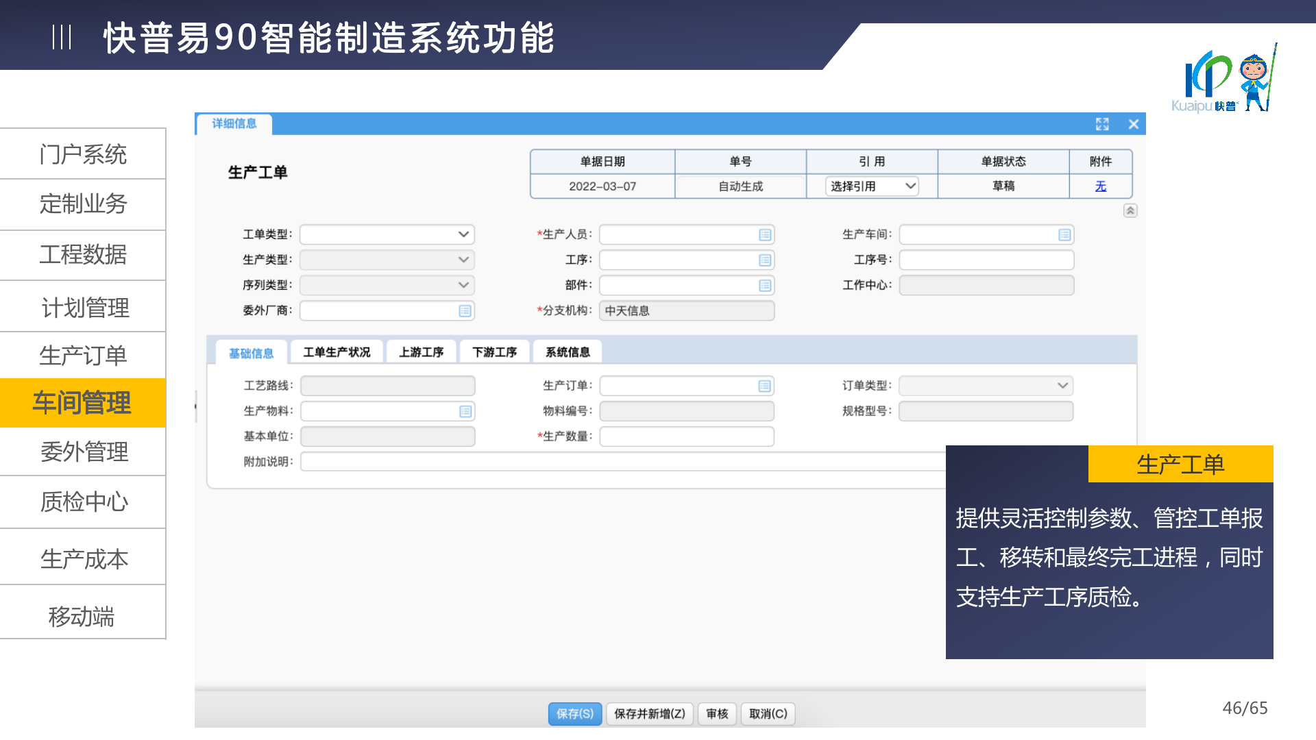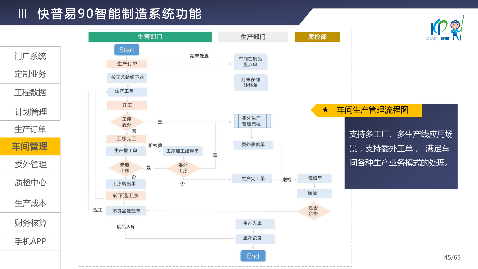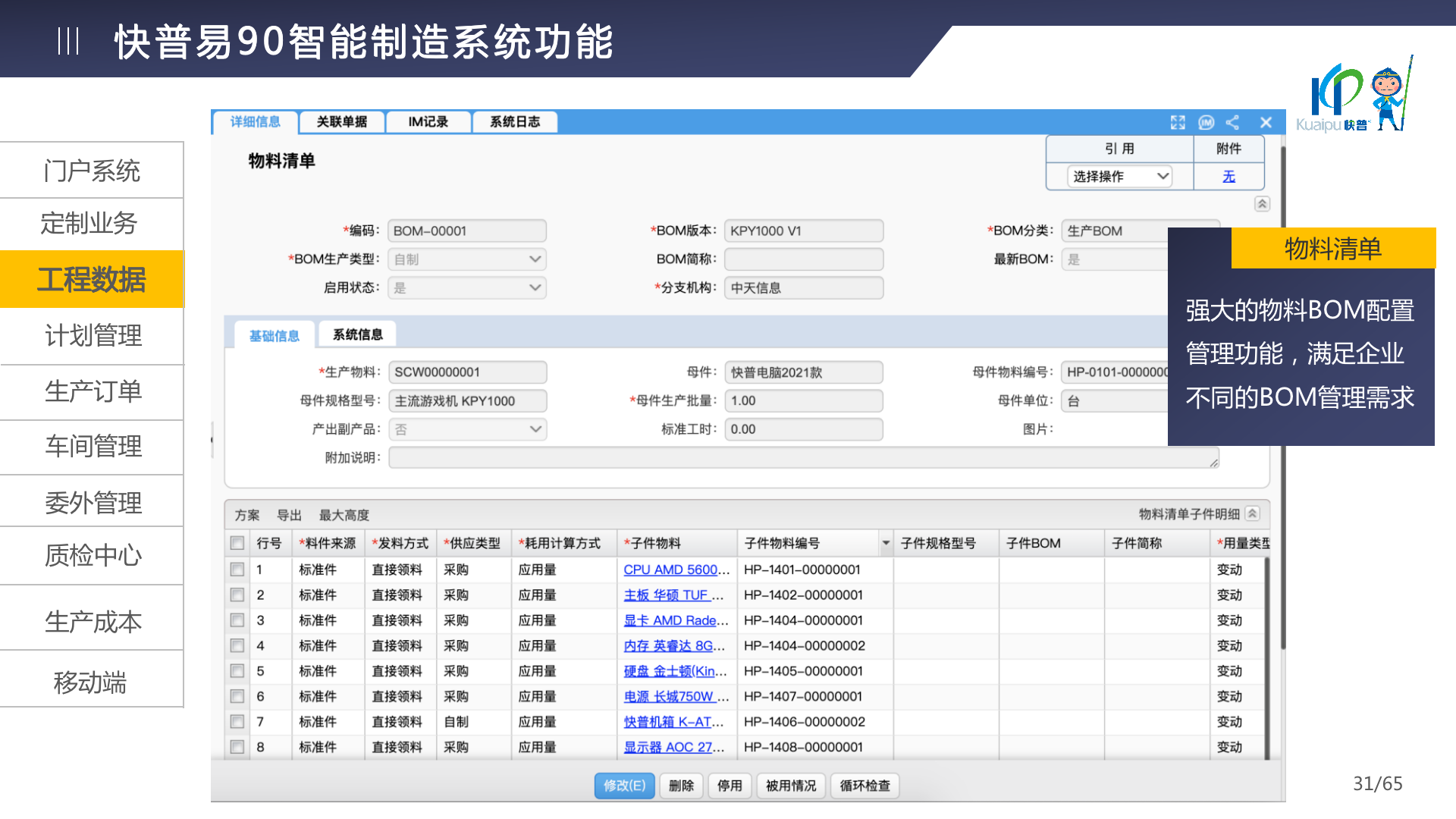 快普易90融合了大量精益生產(chǎn)管理的經(jīng)驗,涵蓋計劃管理、BOM管理、MRP運算、生產(chǎn)訂單管理、供應(yīng)鏈管理、車間管理、出入庫管理、委外管理、質(zhì)量管理、生產(chǎn)成本核算、報表分析等全面生產(chǎn)管理,為企業(yè)打造實時感知變化、分析變化、提供決策的數(shù)字化管理平臺,推動企業(yè)創(chuàng)新的管理,實現(xiàn)“智能制造”的數(shù)字化轉(zhuǎn)型。