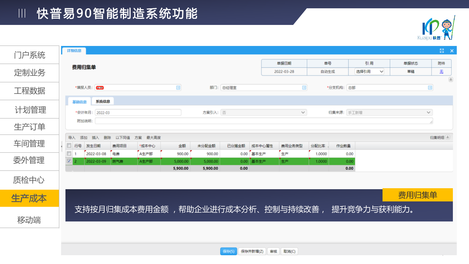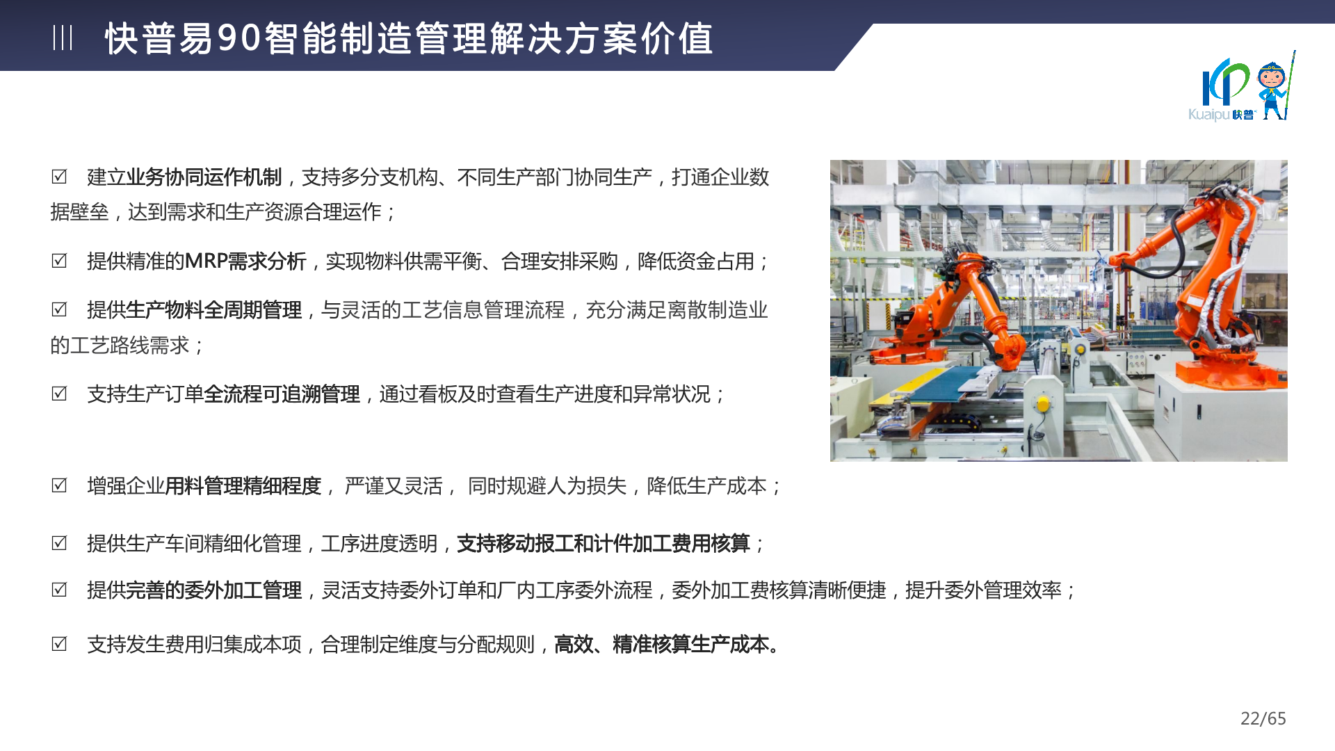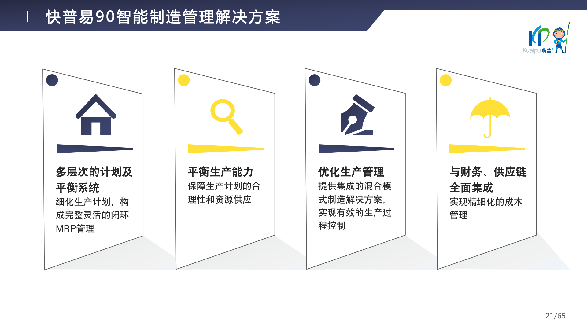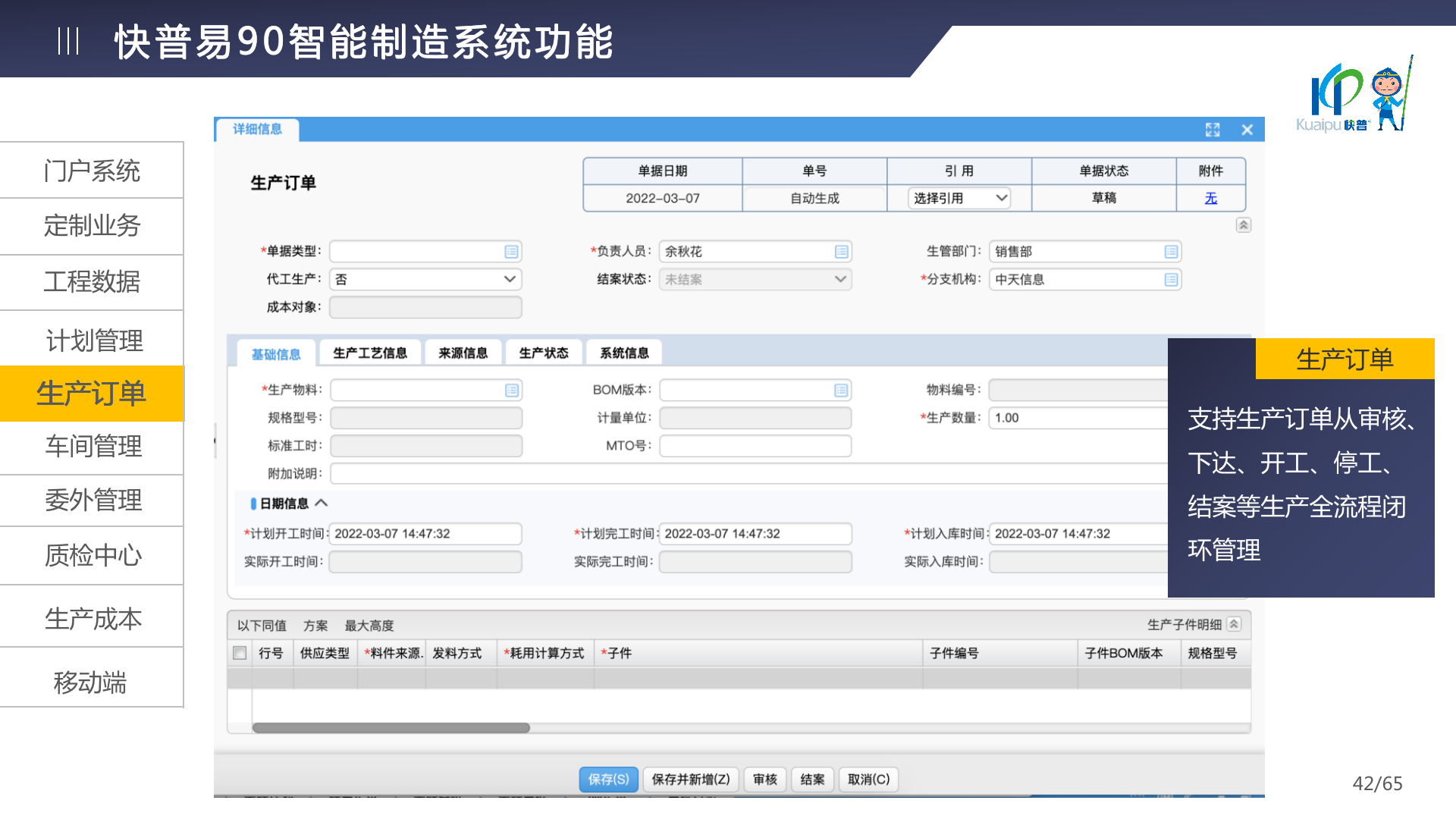 快普易90融合了大量精益生產(chǎn)管理的經(jīng)驗,涵蓋計劃管理、BOM管理、MRP運算、生產(chǎn)訂單管理、供應(yīng)鏈管理、車間管理、出入庫管理、委外管理、質(zhì)量管理、生產(chǎn)成本核算、報表分析等全面生產(chǎn)管理,為企業(yè)打造實時感知變化、分析變化、提供決策的數(shù)字化管理平臺,推動企業(yè)創(chuàng)新的管理,實現(xiàn)“智能制造”的數(shù)字化轉(zhuǎn)型。