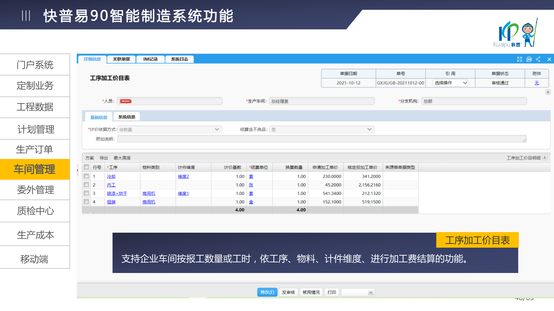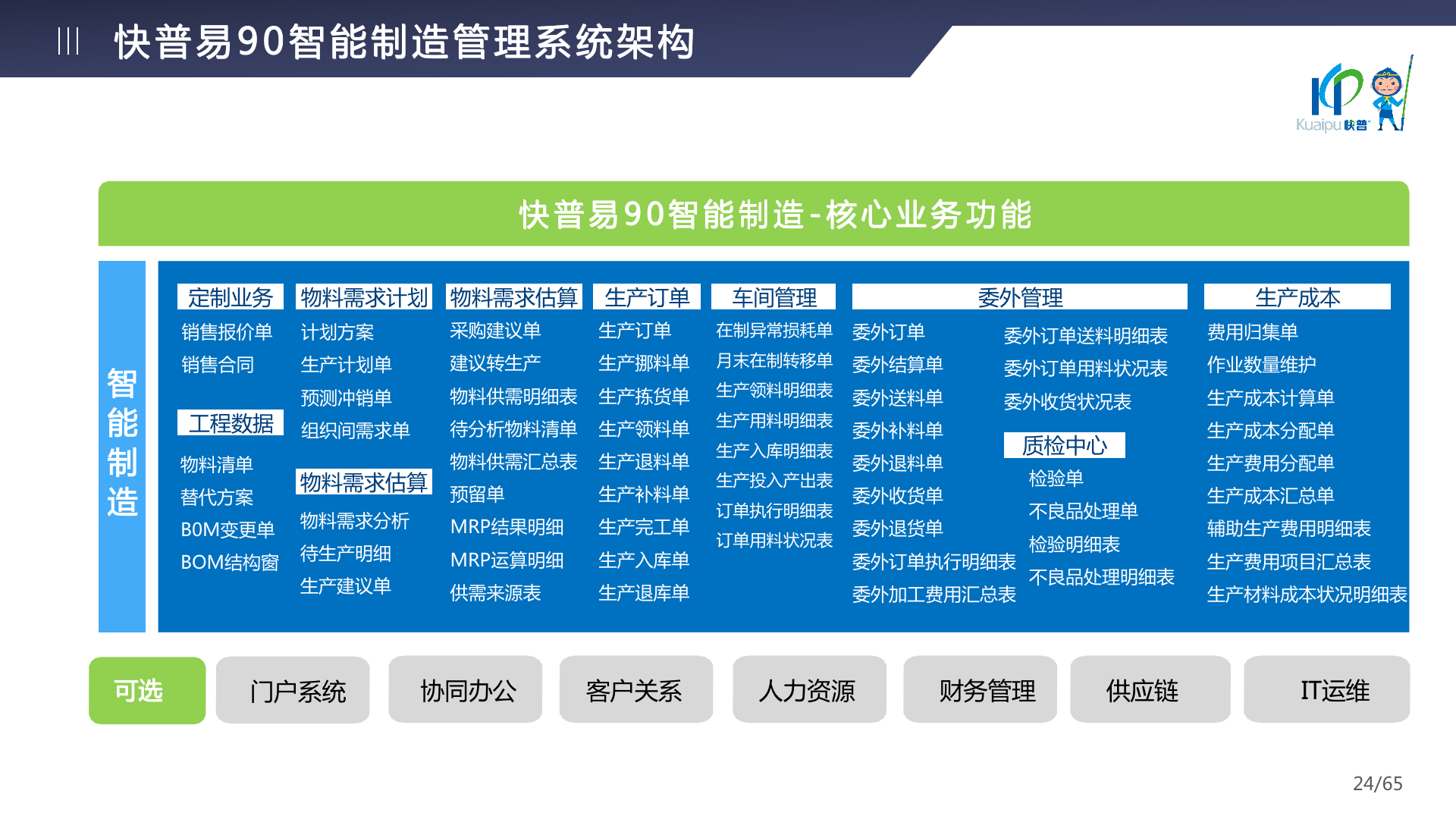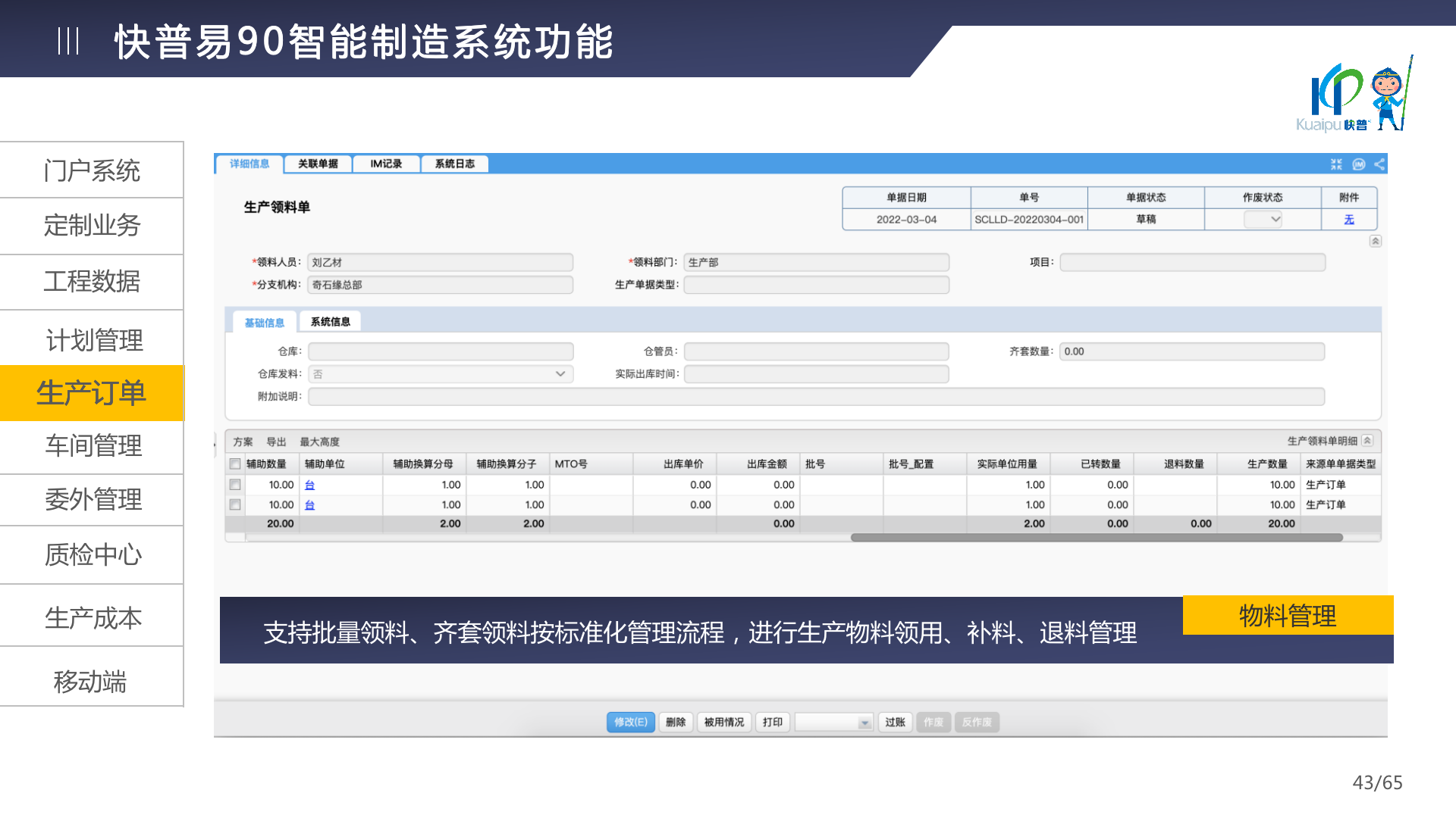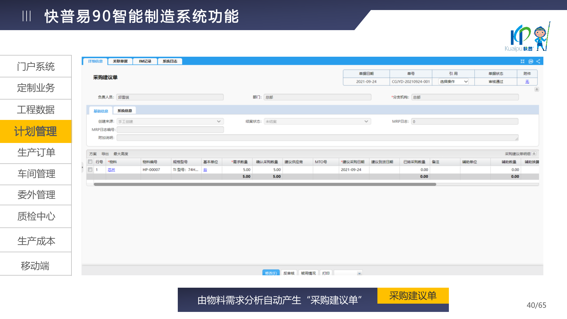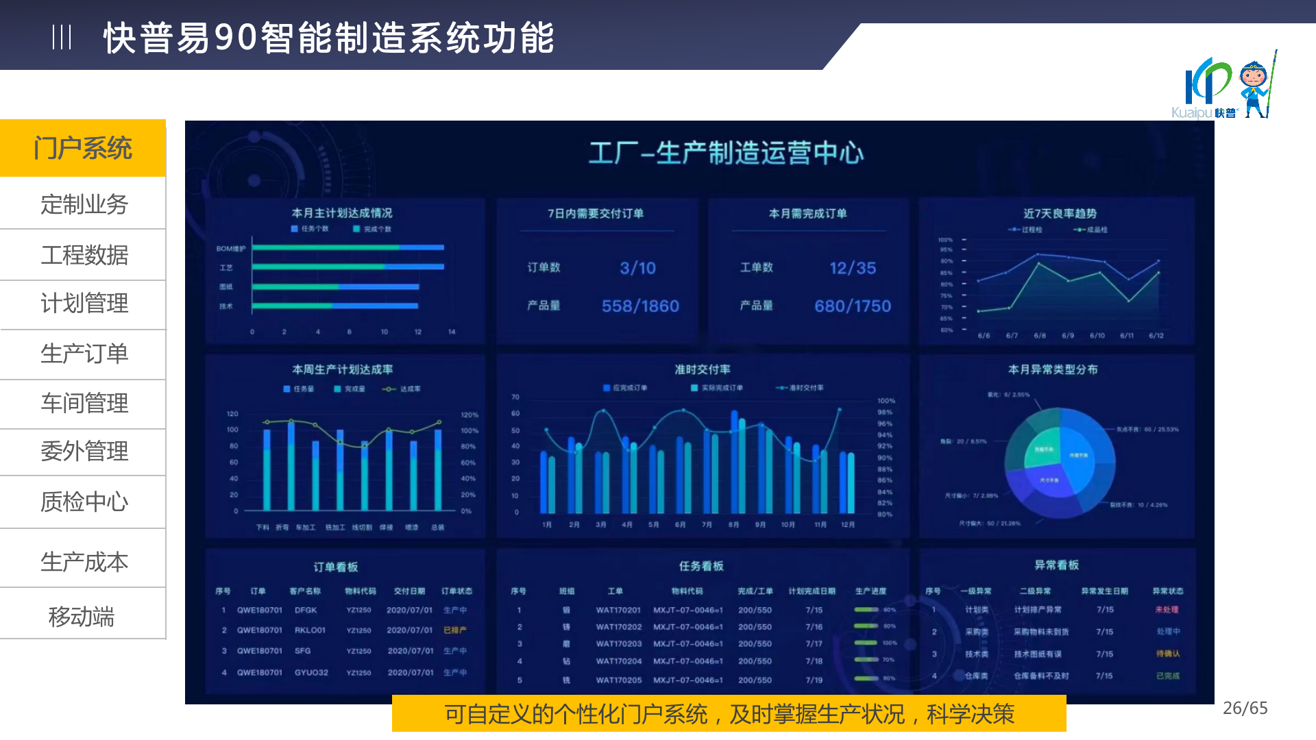 快普易90融合了大量精益生產(chǎn)管理的經(jīng)驗,涵蓋計劃管理、BOM管理、MRP運算、生產(chǎn)訂單管理、供應(yīng)鏈管理、車間管理、出入庫管理、委外管理、質(zhì)量管理、生產(chǎn)成本核算、報表分析等全面生產(chǎn)管理,為企業(yè)打造實時感知變化、分析變化、提供決策的數(shù)字化管理平臺,推動企業(yè)創(chuàng)新的管理,實現(xiàn)“智能制造”的數(shù)字化轉(zhuǎn)型。