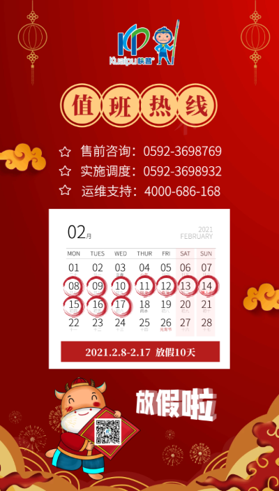 值此春節(jié)來臨之際,根據(jù)《國務(wù)院辦公廳公布2021年春節(jié)放假安排》,結(jié)合公司實際情況與工作安排,現(xiàn)將我司春節(jié)放假安排如下: