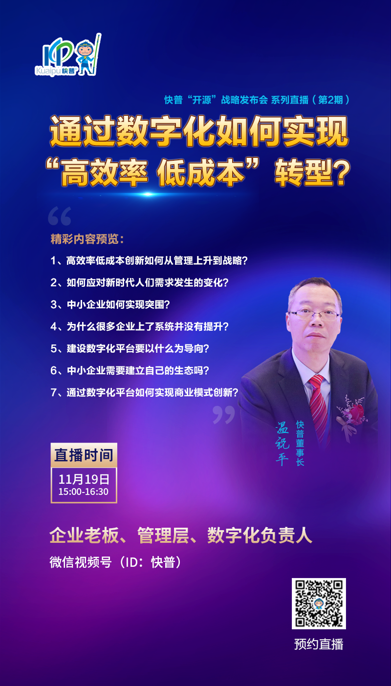 為幫助新老客戶共渡難關(guān),共同面對疫情反復(fù)、俄烏戰(zhàn)爭持久化及中美沖突加劇帶來的各種風(fēng)險(xiǎn)和挑戰(zhàn),幫助中國企業(yè)低成本、高效率進(jìn)行數(shù)字化轉(zhuǎn)型, 快普已正式啟動(dòng)ERP“開源”戰(zhàn)略!發(fā)布會(huì)(系列)直播從10月起通過“快普”視頻號陸續(xù)播出,與您分享近三年快普最新研發(fā)成果及數(shù)字化轉(zhuǎn)型解決方案,歡迎新老客戶預(yù)約收看,相信能為您的企業(yè)轉(zhuǎn)型帶來新的啟發(fā)。