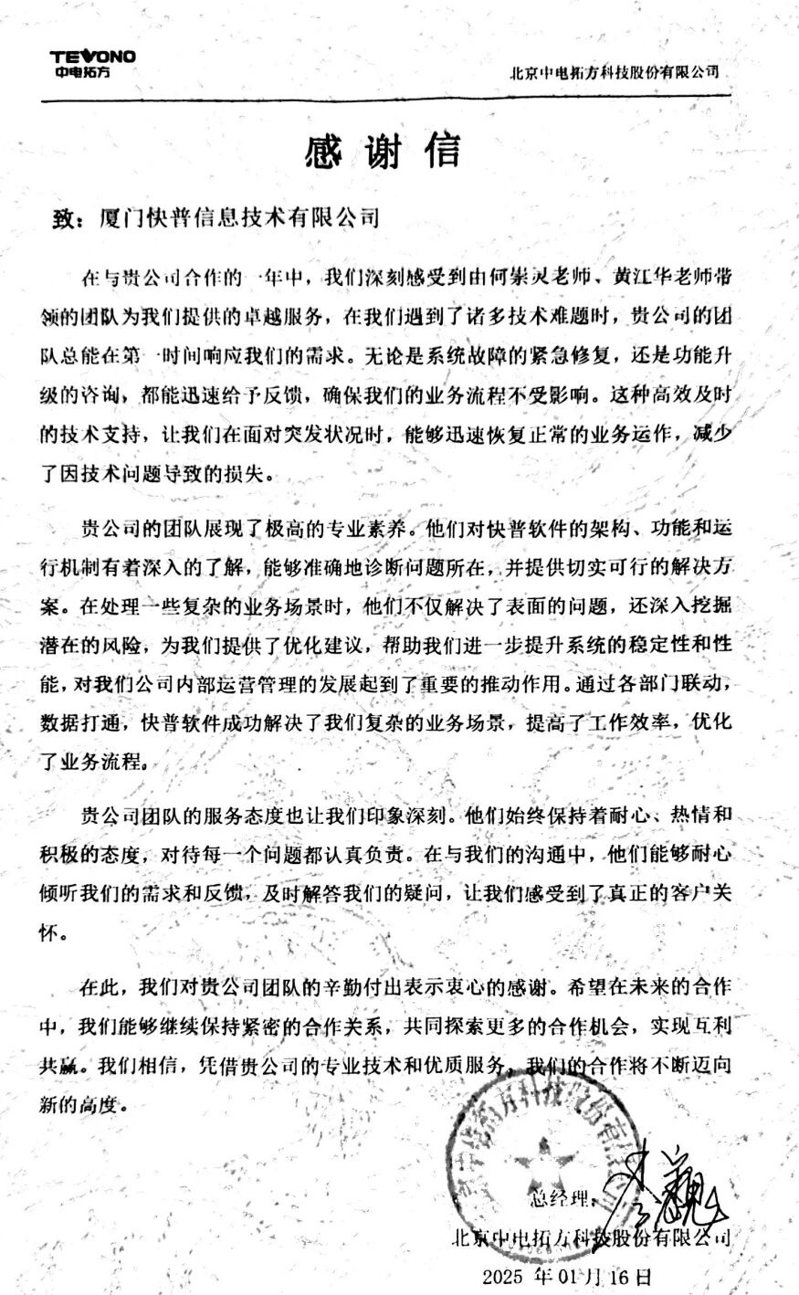 【快普簡(jiǎn)訊】 北京中電拓方科技股份有限公司向我司發(fā)來(lái)感謝信,對(duì)何崇靈老師、黃江華老師帶領(lǐng)的實(shí)施小組在過(guò)去一年中提供的優(yōu)質(zhì)服務(wù)表示高度認(rèn)可和衷心感謝。來(lái)信不僅是對(duì)快普實(shí)施團(tuán)隊(duì)專(zhuān)業(yè)能力的肯定,更是對(duì)快普“客戶至上”服務(wù)理念的詮釋。