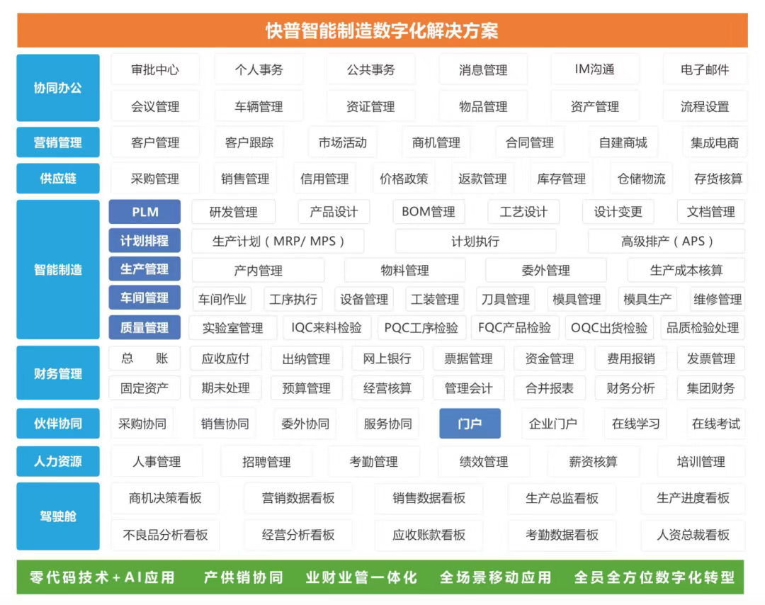 快普智能制造數(shù)字化解決方案融合了12大系統(tǒng),為企業(yè)打造業(yè)財(cái)、業(yè)管一體化平臺(tái),有效解決傳統(tǒng)生產(chǎn)制造業(yè)多個(gè)信息系統(tǒng)數(shù)據(jù)割裂、個(gè)性化定制響應(yīng)慢、成本核算困難、技術(shù)依賴性強(qiáng)等痛點(diǎn),為企業(yè)提供“小、快、輕、準(zhǔn)”的數(shù)字化轉(zhuǎn)型路徑。